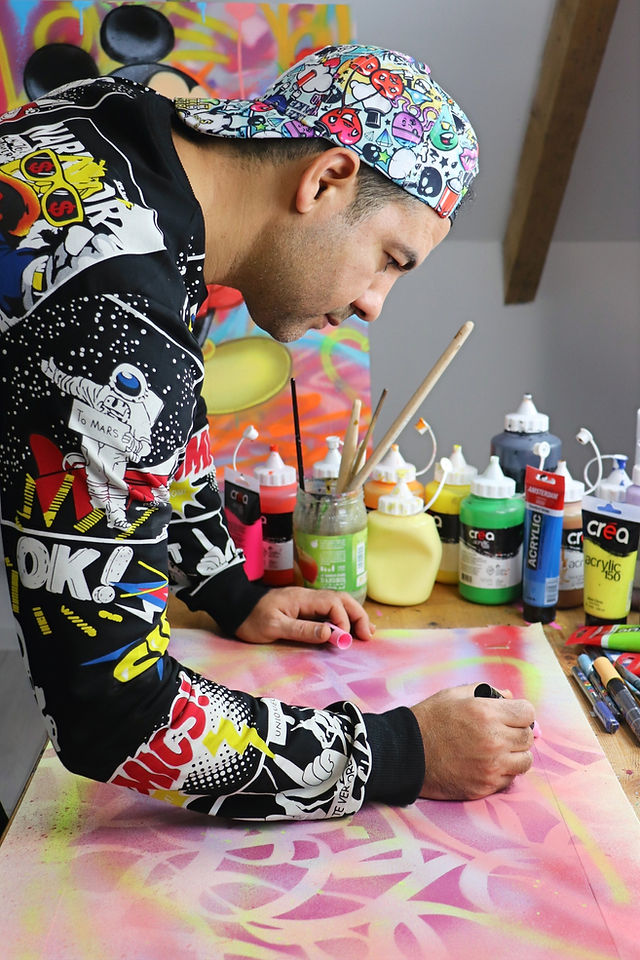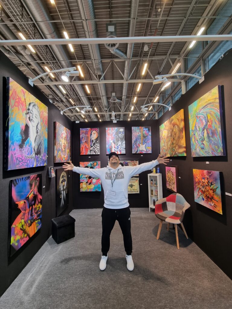 Chez lui, l’art n’est pas une posture : c’est une respiration. Et chaque toile, chaque fresque, chaque trait de spray raconte une part de sa quête celle de la beauté, du mouvement, de l’émotion pure.