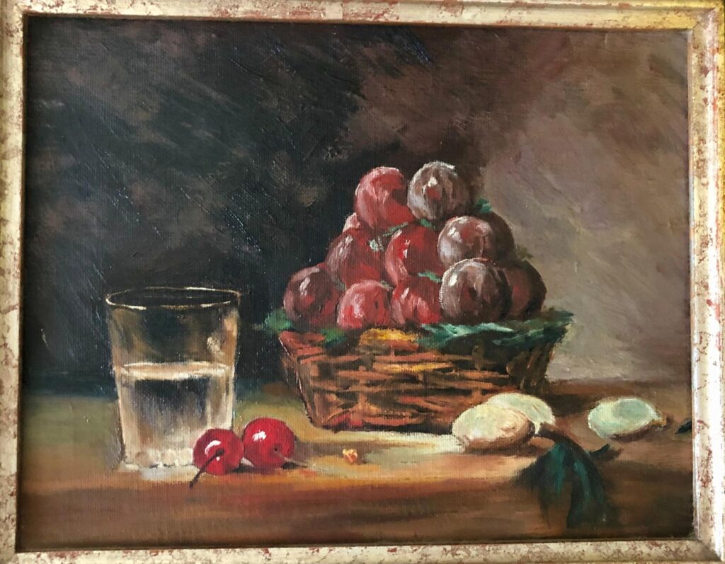 Durant cette expérience merveilleuse, il découvre le peintre Chardin, maître incontesté des natures mortes. Cette révélation éveille en lui le désir d’essayer de peindre à l’huile, et, il achete un livre intitulé comment peindre à l’huile. Les œuvres de Chardin l’émeuvent profondément : il éprouve toujours un immense bonheur à contempler ses tableaux, car, à ses yeux, la vie se dégage de chaque toile. Les objets y semblent habités, comme s’ils communiquaient et dialoguaient entre eux, créant une atmosphère silencieuse mais intensément vivante. Il souligne que l’expression anglaise still life est beaucoup plus revelatrice de ce qu’il ressent que le mot français nature morte qui est tres réducteur.