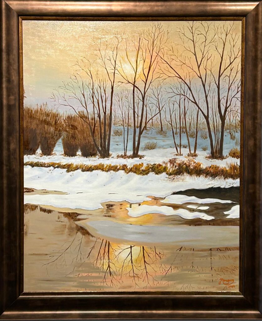 Le soleil décline à l’horizon, et avec lui le jour se retire sans disparaître tout à fait. Le ciel s’embrase de tonalités chaudes ocres dorés, rouges assourdis, roses profonds que la matière huileuse fond et mêle avec douceur. Rien n’est abrupt. Les transitions se font par glissements subtils, comme si la lumière elle-même hésitait à quitter la scène. L’huile permet cette continuité, cette profondeur vibrante que n’offre aucun autre médium.