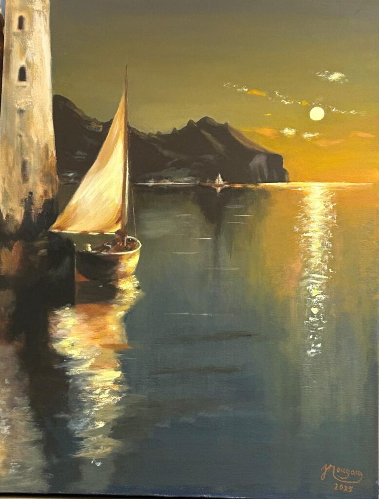 La peinture à l’huile est un art du temps long. Elle exige patience, écoute et abandon. Chaque couche dialogue avec la précédente, chaque nuance s’installe lentement, laissant à la lumière le soin de se déposer, de s’approfondir, de respirer. Dans ce tableau représentant un coucher de soleil sur le port, l’huile révèle toute sa puissance expressive, sa capacité unique à retenir l’instant tout en lui donnant une densité presque intemporelle.