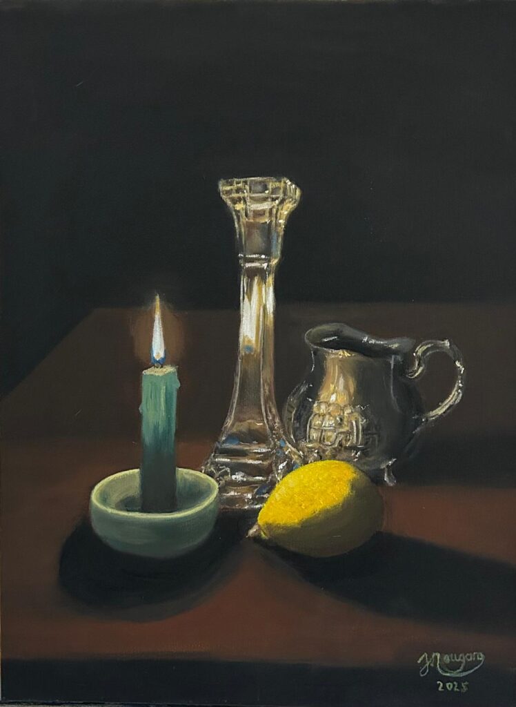 Car peindre des objets, c’est précisément interroger ce mystère : comment ce qui ne vit pas peut-il nous émouvoir, nous retenir, nous habiter avec une telle intensité ? La nature morte n’est jamais immobile. Elle est un lieu de présence silencieuse, un espace où la matière devient chargée d’âme.